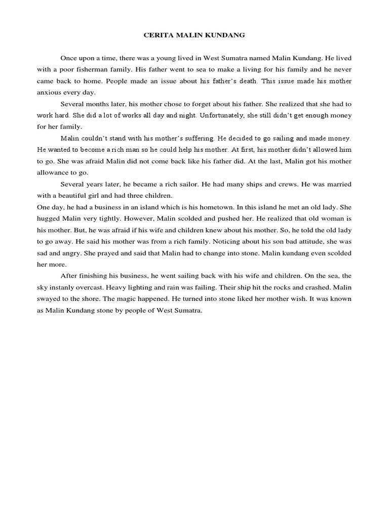 Cerita sasakala malin kundang bahasa sunda merupakan cerita yang berasal dari daerah sumatera barat. He always helps his mother to earn some money. Cerita malin kundang singkat halo apa kabar teman teman kali ini aku ingin bercerita tentang legenda masyarakat indonesia yang sudah sangat terkenal yaitu tentang ringkasan cerita rakyat malin kundang anak durhaka lengkap dengan dialog. Bulu perindu sukma bulu perindu asli kalimantan minyak bulu perindu asli kalimantan di dalam blog ini akan saya jelaskan tentang khasiat dari bulu perindu yang melegenda. Cintai dan sayangi mereka dahulu kala hiduplah seorang pemuda bernama malin kundang.